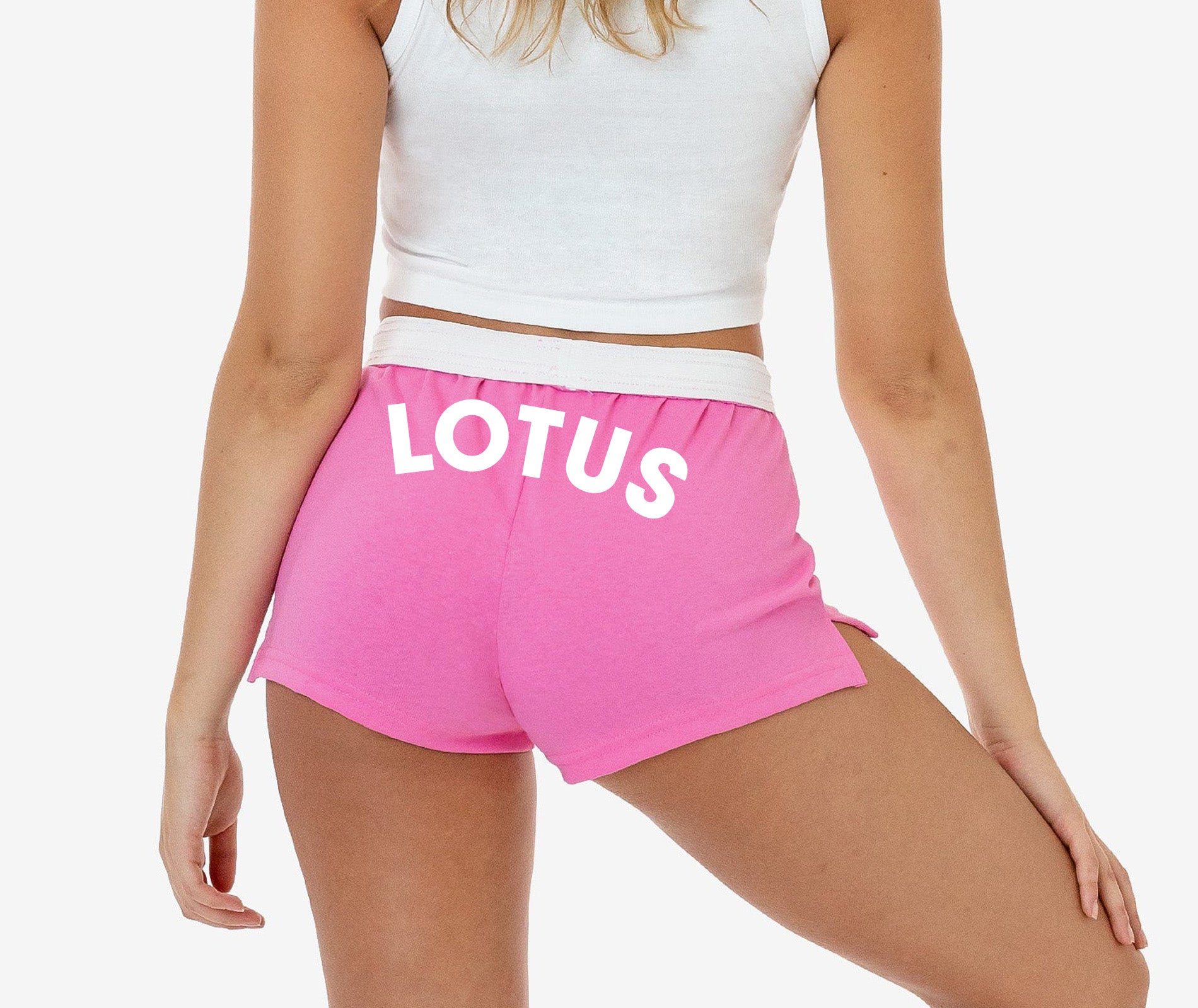 LA Apparel P.E. Shorts. Bubblegum Pink. With "Lotus" heat transfer type across rear. 100% cotton with elastic waistband. **LOTUS font is applied using heat transfer to prevent cracked ink, but high heat dryers or irons will warp the transfer**