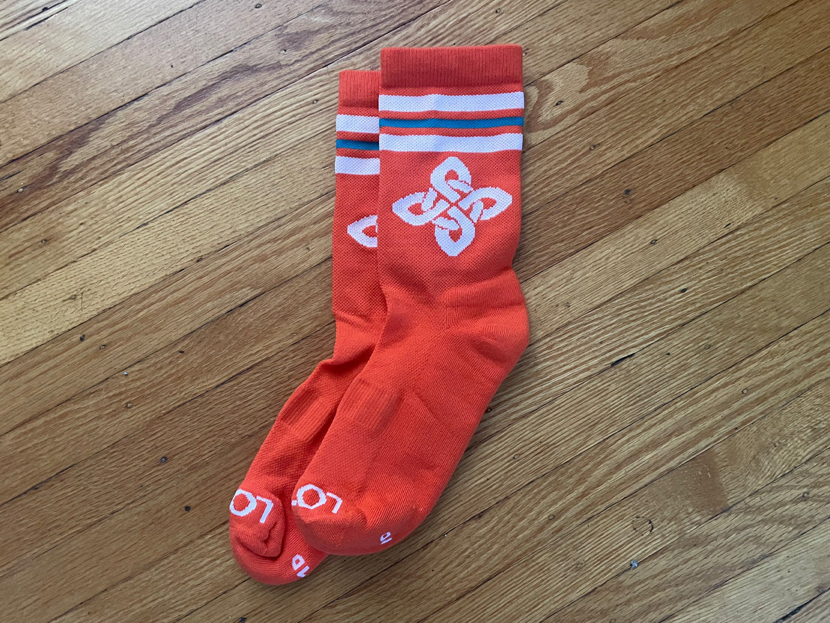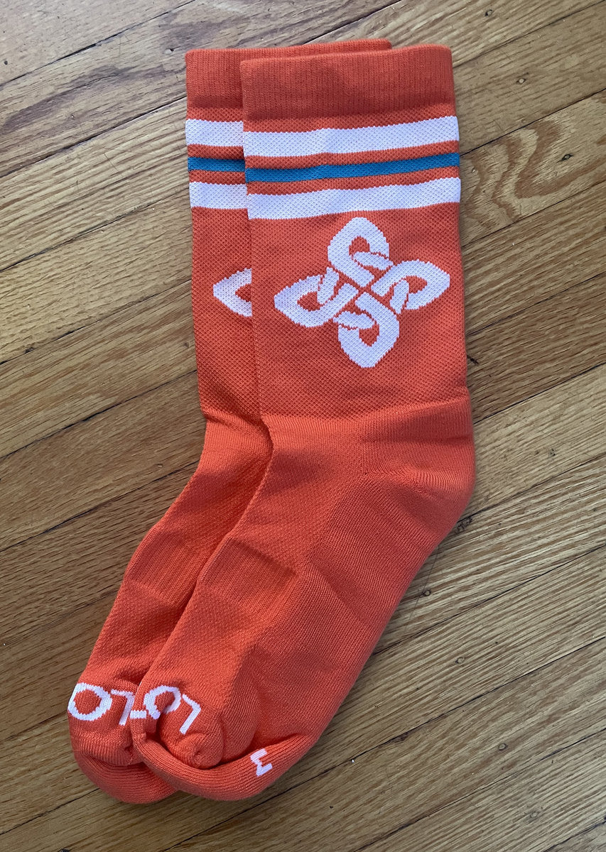 Knit crew socks. Celtic logo on sides, Lotus on toe. High-quality socks with reinforce heel and toe. White/Teal stripes, White logos.