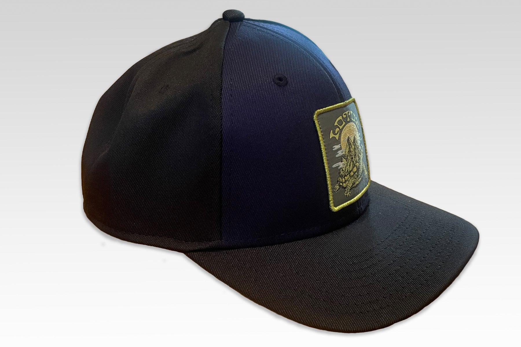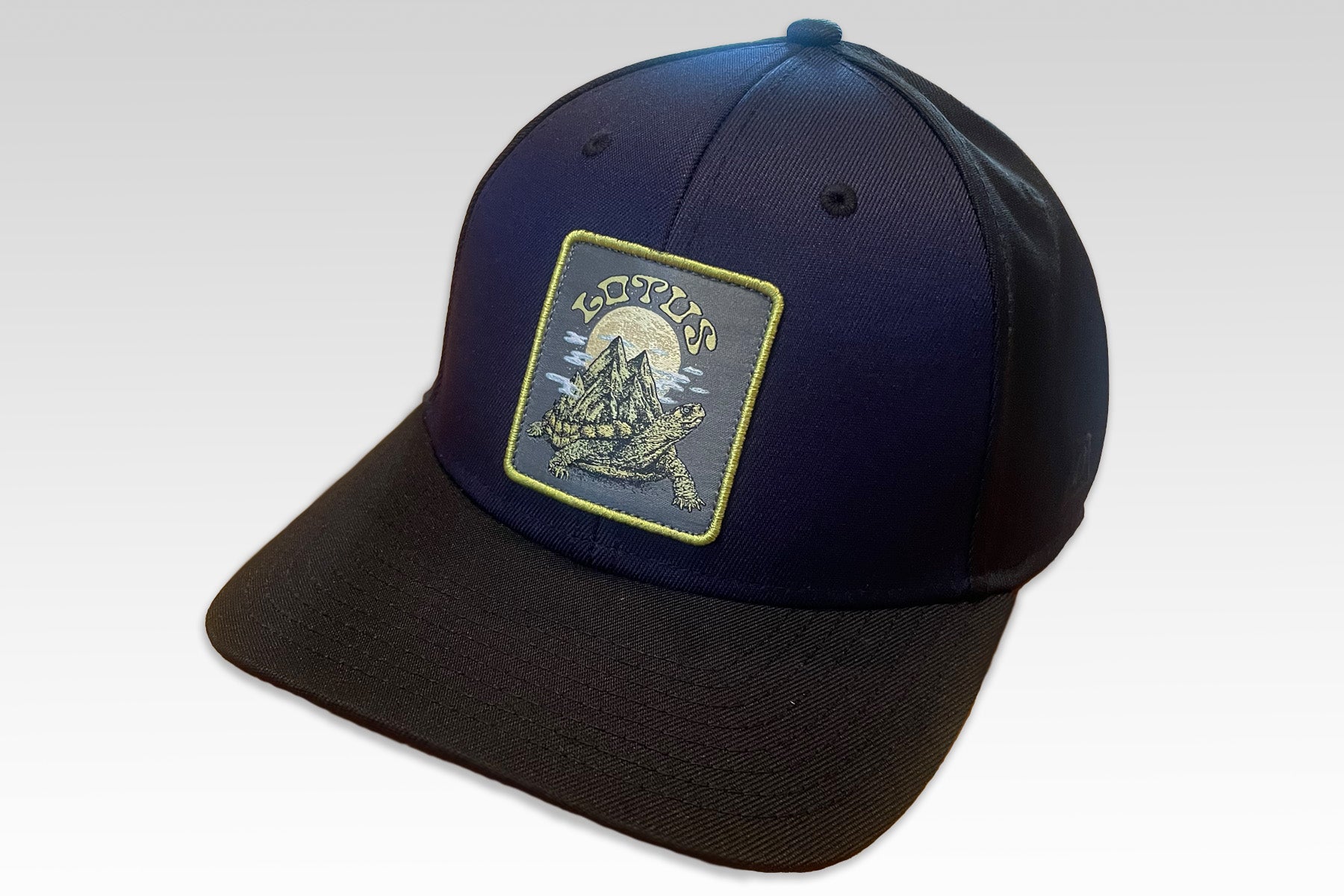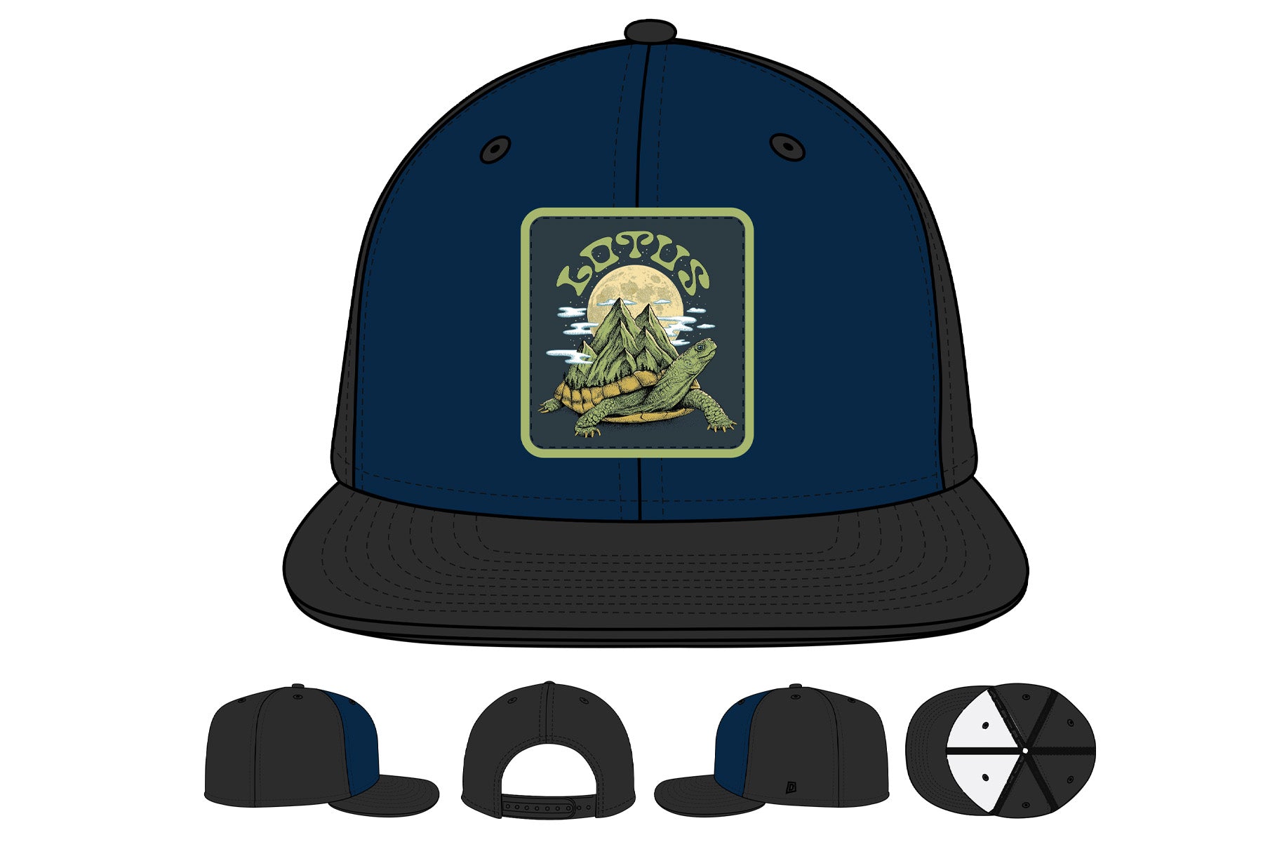 Woven turtle patch on Dome Headwear snapback hat. Black with dark blue front panels. Slightly curved bill.